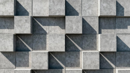 Rough gray concrete wall facade showcasing a striking geometric pattern of protruding and recessed cubes, highlighted by high contrast, sharp sunlight, and deep angular shadows.