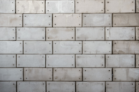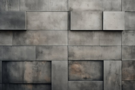 Grey geometric wall with grunge blocks and strong lines on texture made abstract structure. Background with rectangular concrete blocks on the surface.