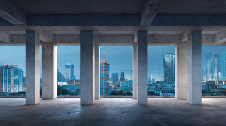 Unfinished interior space featuring concrete pillars and openings, providing a breathtaking city skyline view during twilight. Perfect for urban architecture themes.