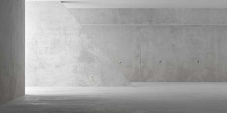 Abstract empty, modern concrete room with indirect lighting from left with sloped wall and rough floor - industrial interior background template, 3D illustration