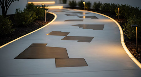 An illuminated pathway showcases a contemporary design with abstract geometric patterns. The image features a cool-toned concrete surface accented by warm, ambient lighting. The composition suggests an outdoor setting, possibly for architectural or landscaping purposes, suitable for various editorial and commercial applications.