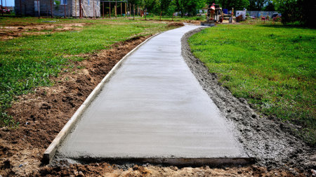 Newly poured concrete walkway is being constructed in a grassy area. The edges of the walkway are clearly visible, as well as the surrounding grass and soil.