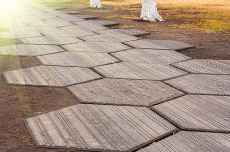 details of the road made of natural wood materials, closeup on the pavement