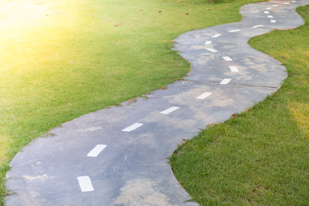 Curve cement pathway on the grass with sunlight : warm tone filter.