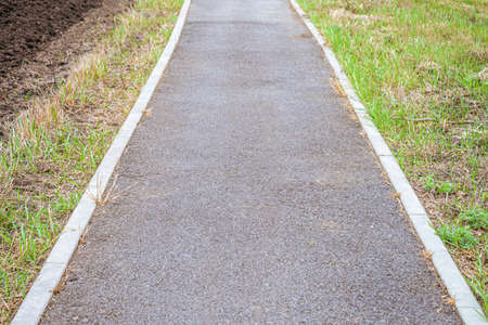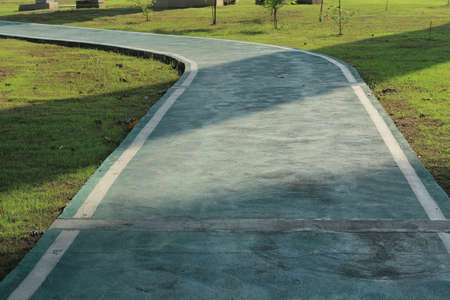 Path that slopes in front of a concrete road. Two beside with green lawn. for transport background.