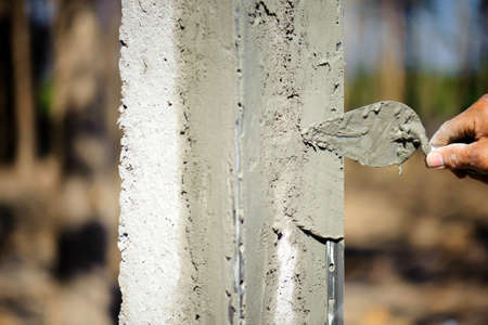 Workers are using a trowel to decorate the cement pillars into a beautiful ridge.