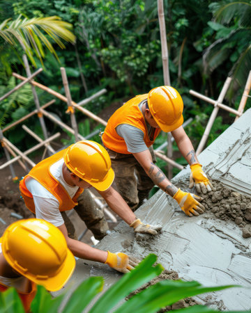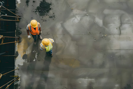 Construction workers wearing hard hats are working together on a cement project at a construction site.