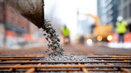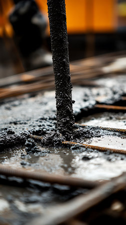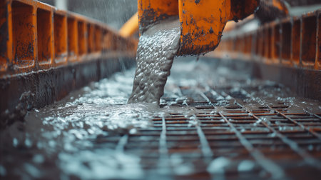 Macro shot of concrete flowing from a chute onto a rebar grid, highlighting texture details with dramatic shallow focus. Captures the dynamic process of construction work.