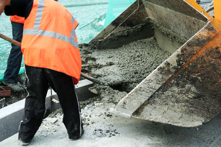 A construction worker in an orange vest pouring concrete into a mold at a site