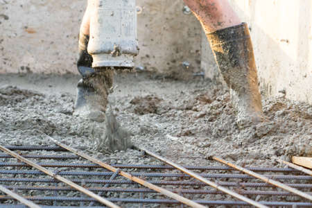 Workers pour wet concrete on the prepared surface for the construction of the foundation, under which steel reinforcement is visible to give strength to the structure.