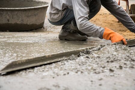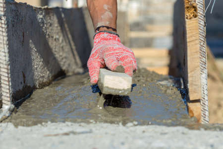 Construction man working with cement floor finishing - fresh concrete work with construction hand tool concept