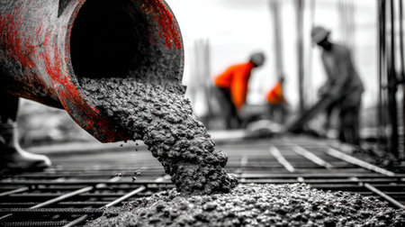 Concrete flows from a container, forming a pile on a metal grid. The image utilizes a selective color technique, highlighting the orange attire of the workers against a grayscale backdrop. The scene suggests an outdoor construction environment, possibly suitable for architectural, industrial, or building materials content.
