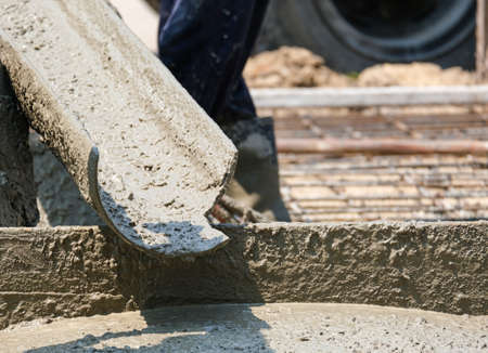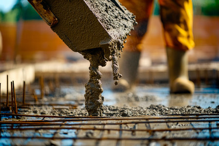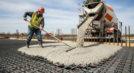 An image captures concrete pouring on a construction site, highlighting freshly poured material. The scene features an out-of-focus worker, likely involved in the process, alongside construction elements. It presents a daylight setting with a clear blue sky, suitable for illustrations in editorial, commercial, or educational contexts.