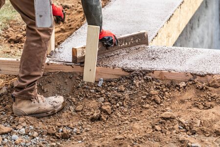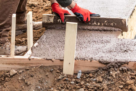 Construction Worker Leveling Wet Cement Into Wood Framing.
