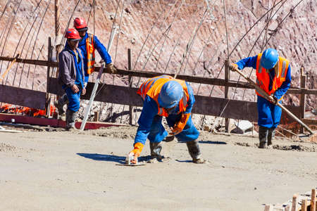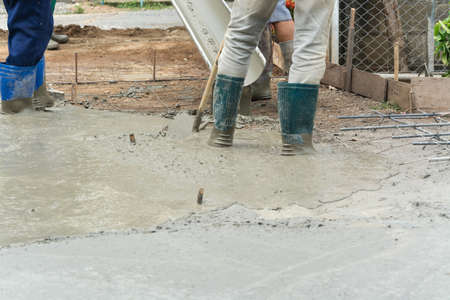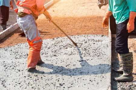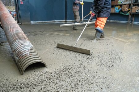 Workers are using tools to smooth the concrete floor. Road construction or general surface repair