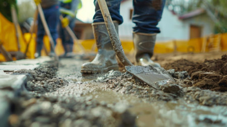 The workers using brushes and tools to remove excess concrete and create precise edges and corners an important step in ensuring a structurally sound foundation