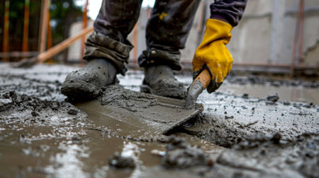 A construction worker uses a trowel to smooth out the surface of the poured cement ensuring a level and sy foundation