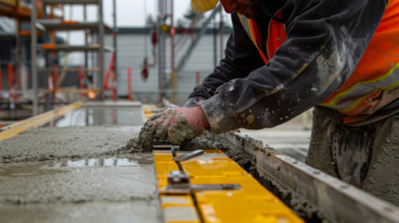 A construction worker is seen pouring concrete at a job site, showcasing the hard work and skill involved in building structures. The image captures the manual labor and dedication in urban construction projects.