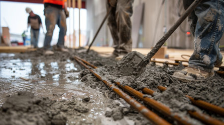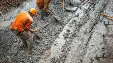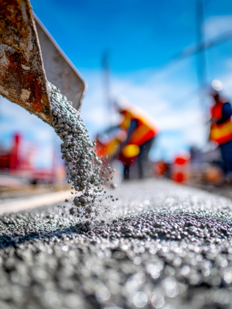 Skilled laborers spread liquid concrete at an open-air construction area, with a bright sky overhead, symbolizing progress in city expansion efforts.
