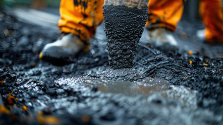 A close-up captures the process of pouring liquid asphalt onto rebar, used for construction reinforcement. Detail highlights the textures and process in asphalt application.