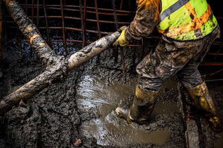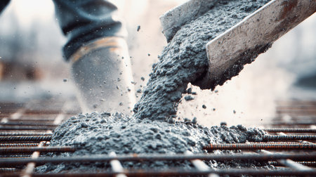 A worker skillfully pours concrete onto reinforcing mesh, showcasing precision and focus in this vital construction task, surrounded by a clean, bright background.