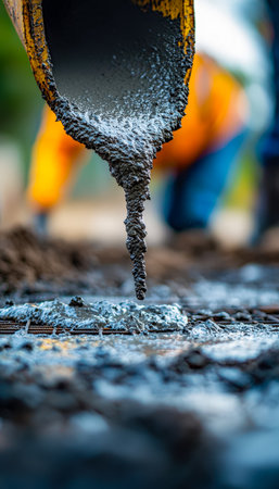 Concrete is being skillfully poured at a construction site, capturing the intricate details of the mixture and the focus of the worker's hands in this engaging process.