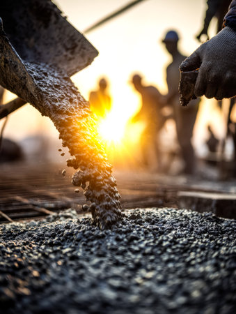 As the day fades into evening, laborers skillfully layer freshly mixed concrete, casting a golden glow over the bustling site and highlighting their diligent efforts.