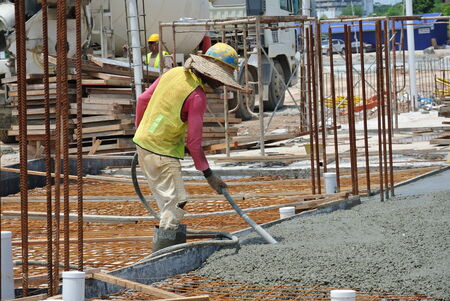 Construction workers pouring concrete mix into reinforcement formwork at building site