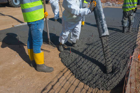 Pouring Concrete mix into mold and using concrete vibrator at construction site