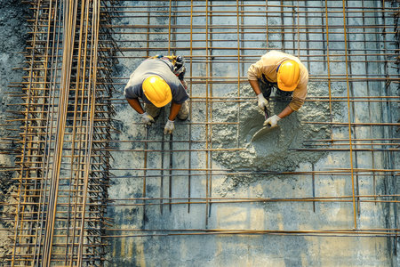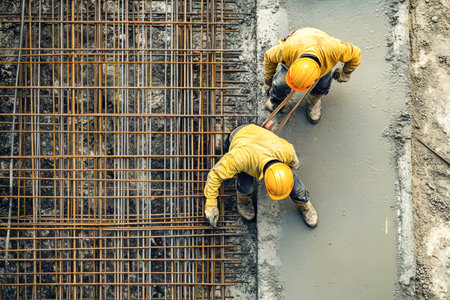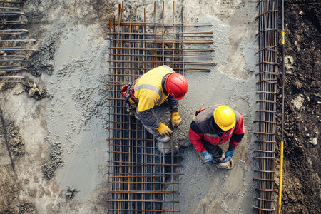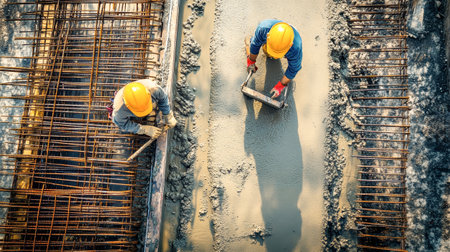 Two construction workers skillfully manage rebar and pour concrete, creating a solid foundation in a bustling building site under bright studio lighting.