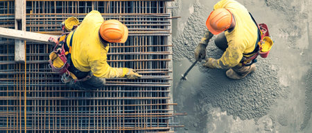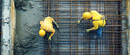 Two construction workers in bright yellow gear pour wet concrete over steel rebar, showcasing precision and teamwork in a vivid natural setting.