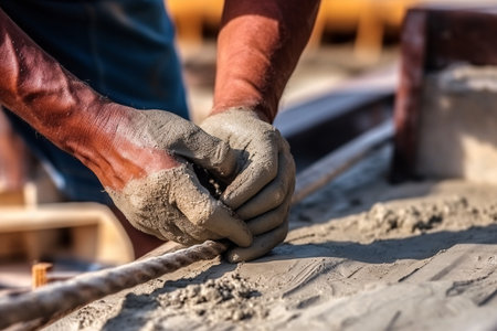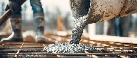 Close-up of a laborer pouring liquid cement onto a steel grid at a construction site, crafting the foundation of a new building in natural light.