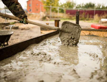 A construction worker is shown pouring wet concrete onto a road surface using a trowel. The image displays the process with close-up focus on the materials and action. The sunlight illuminates the scene suggesting an outdoor setting. The image is suitable for various commercial purposes.