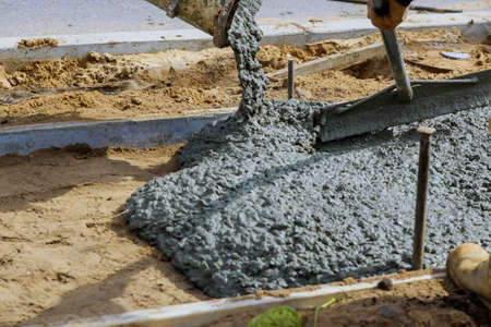 Workers concrete mixer with pouring cement during to residential sidewalk