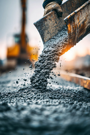 Dynamic view of concrete and dirt at a construction site, showcasing heavy machinery and the groundwork process in action. Perfect for industry visuals.