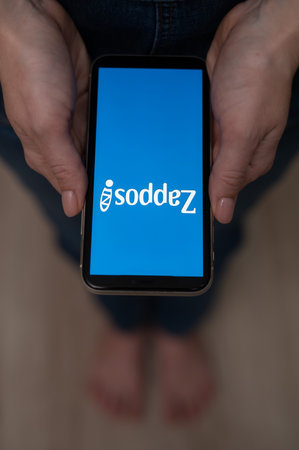 December 3, 2022 Almaty Kazakhstan: Barefoot woman holding smartphone with zappos logo.