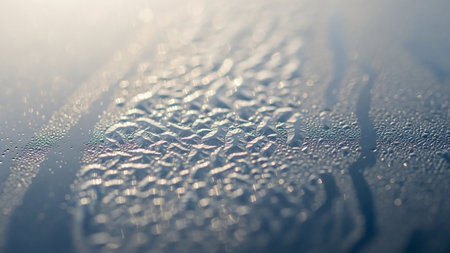Macro view of numerous small water droplets forming a textured pattern on a dark, reflective surface with bright light reflections.