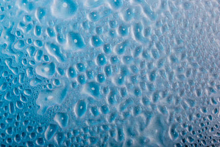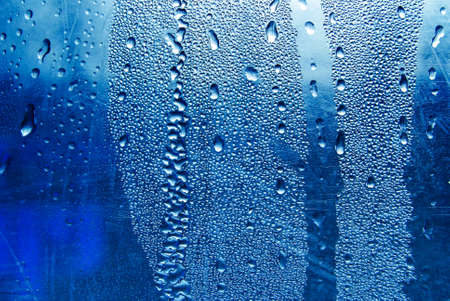 water droplets on glass. close-up. macro plan. blue background.