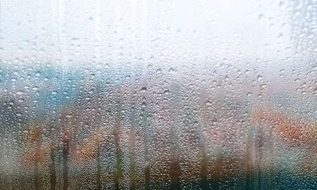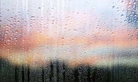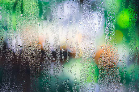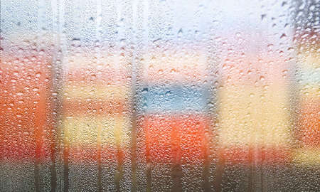 Condensation on the clear glass window with colorful background. Water drops. Rain. Abstract background texture