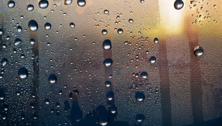This image features a close-up view of droplets on a foggy glass surface, showcasing beautiful condensation patterns against warm light outside.