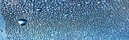 Banner with blue water drops on the glass, abstract background, large and small drops. Space for text