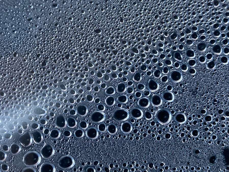 Pattern of water drops in a shining metallic surface with sky reflections, Water droplet on the car hood. Realistic pure water droplet water drops for creative banner design