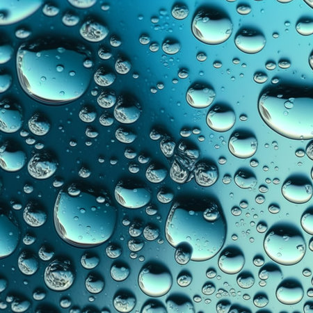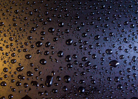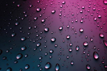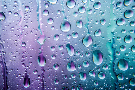 Surface. showing macro water droplets on a colored surface keywords: water, droplets, drops, condensation, moisture, wet, surface, macro, close-up, texture, background, abstract, blue, orange, pink, gradient, light, reflection, refraction, clear, transparent, refreshing, clean, dew, liquid, science, detail, pattern, natural, atmospheric description: a macro photograph captures numerous small and large water droplets clinging to a surface. the droplets are clear and spherical, reflecting the...