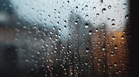 A close-up view showcasing raindrops on a windowpane, creating a serene atmosphere. The warm light reflects softly, adding comfort to the indoor scene.