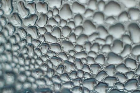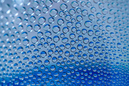 water droplets on glass. close-up. macro plan. blue background.