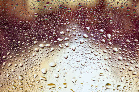Water drops on window glass at sunset or sunrise. Natural background with copy space.