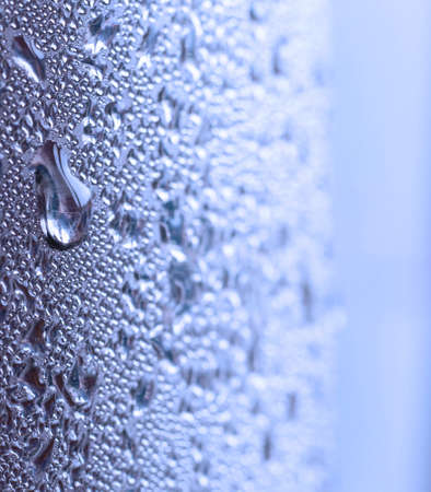 Raindrops on window. Wet glass blue tone background. Fresh water droplets.