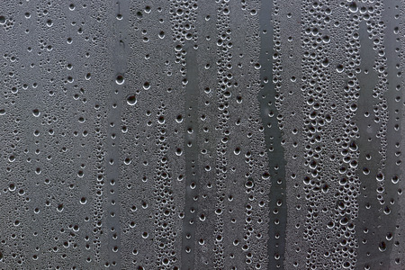 Close up water drop on gray background, misted glass with droplets of water draining down. Dripping Condensation