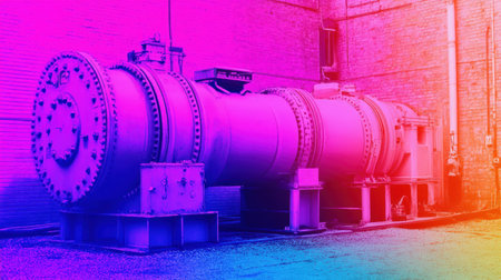 This image features an industrial machinery installation captured with vibrant lighting. The juxtaposition of mechanical engineering with artistic effects creates a unique urban aesthetic.