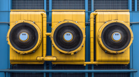 A striking image of three industrial cooling units featuring vibrant yellow fans mounted on a blue wall, showcasing modern engineering and urban aesthetics.